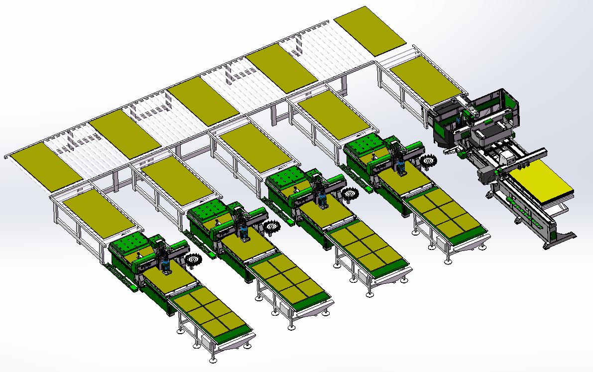 品脈櫥衣柜模壓門板生產(chǎn)線采用1拖4方式,針對模壓門板生產(chǎn)的生產(chǎn)線,主要能實(shí)現(xiàn)在門板背面完成打標(biāo),打鎖孔,進(jìn)玻璃門加工。整板材料翻面、分配、輸送到正面加工機(jī)器,完成門板正面造形加工、玻璃門切斷。完成后機(jī)機(jī)器自動把材料推出到下料臺上人工分單,日產(chǎn)量可達(dá)到300-350平方。