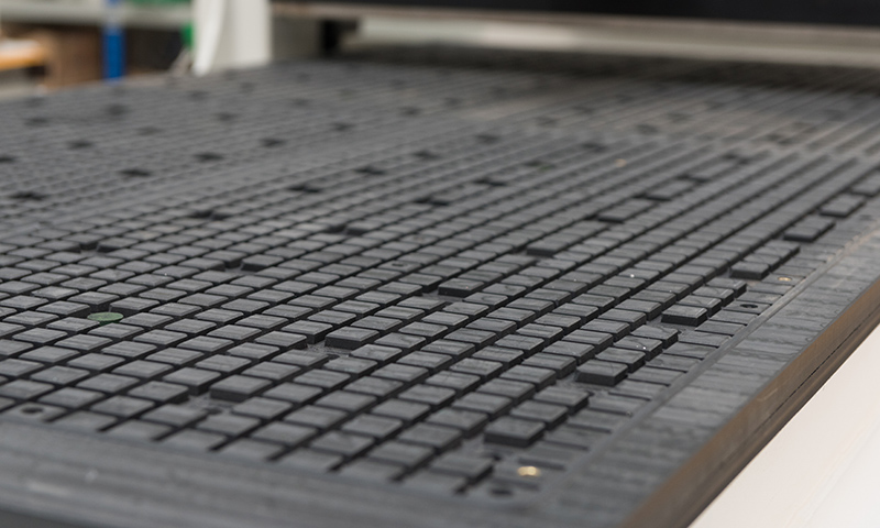 雙層真空吸附臺面,臺面結(jié)構(gòu)為分為上下兩層,中間帶儲氣室,臺面有128個及以上的吸附孔。加工時板件固定,一是靠真空泵的吸力,二是靠真空泵抽空臺面氣室內(nèi)的氣體,造成低壓氣室,然后通過大氣壓強來壓住板件,讓板件不輕易滑動。是目前主流的數(shù)控開料機臺面結(jié)構(gòu)。并且加工小板比較小,或者工件透氣性很好,可以選擇給機器加配壓輪,以達到更好的加工效果。