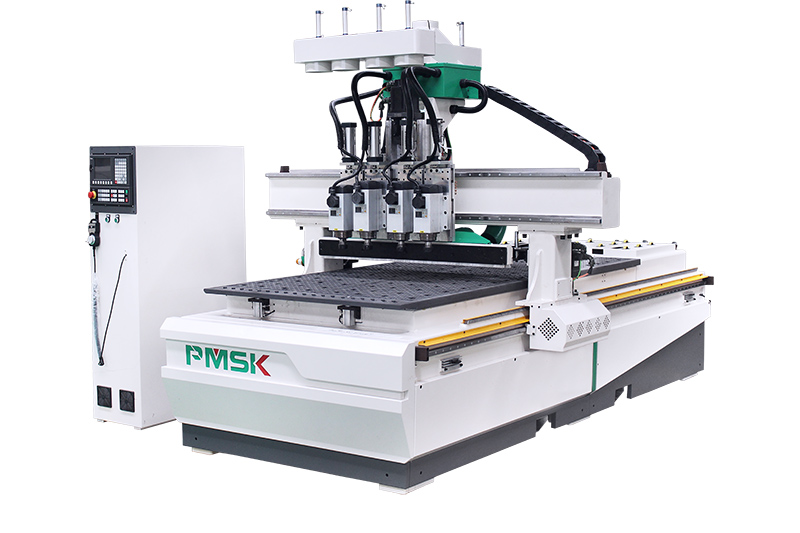 1.機(jī)器結(jié)構(gòu)由四個(gè)主軸組成,氣動(dòng)切換。安裝四個(gè)不同的刀具,實(shí)現(xiàn)板式家具開(kāi)料、打孔、開(kāi)槽,櫥柜門(mén)板銑型等工藝。