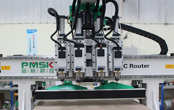 數(shù)控開(kāi)料機(jī),機(jī)頭部位搭載四個(gè)主軸,在加工櫥柜時(shí)主軸上裝載的刀具分別為6mm,8mm,10mm,15mm。在打孔時(shí)四個(gè)主軸氣動(dòng)切換來(lái)解決所需孔位,在開(kāi)槽和開(kāi)料時(shí)兩個(gè)裝載6mm刀和8mm刀的主軸進(jìn)行加工,同時(shí)